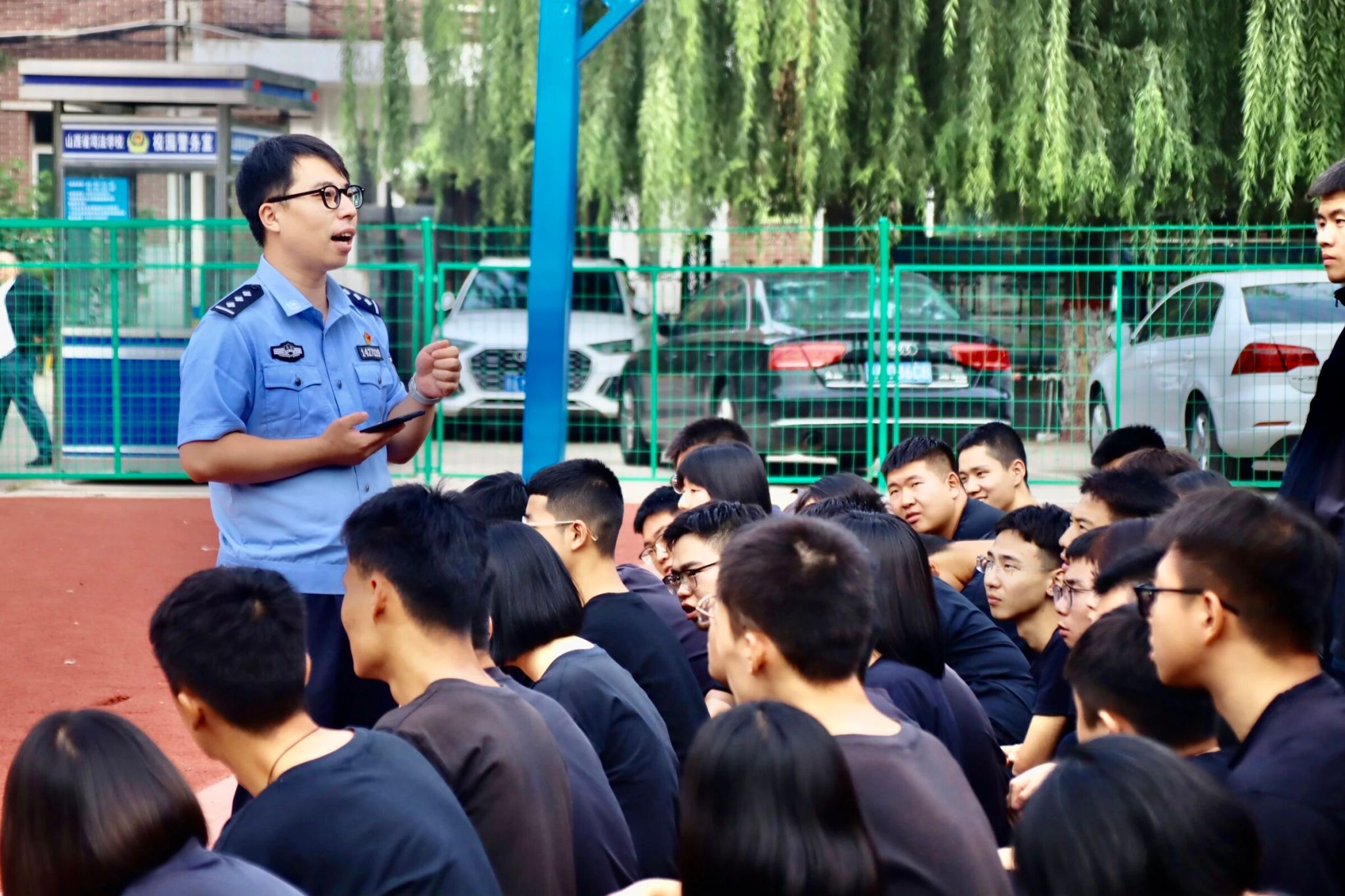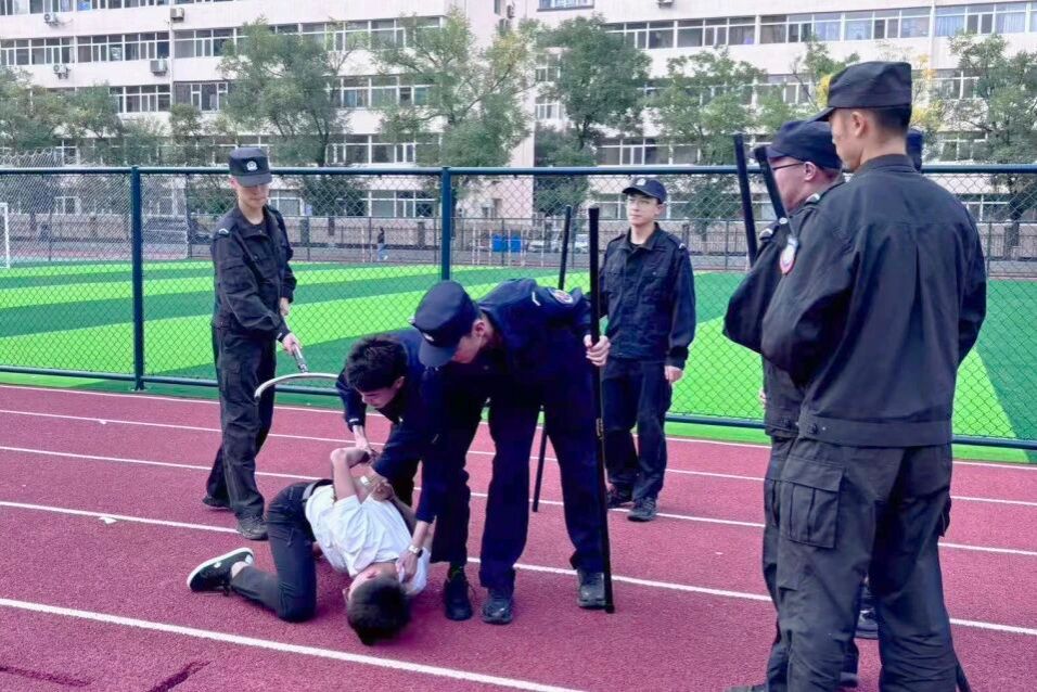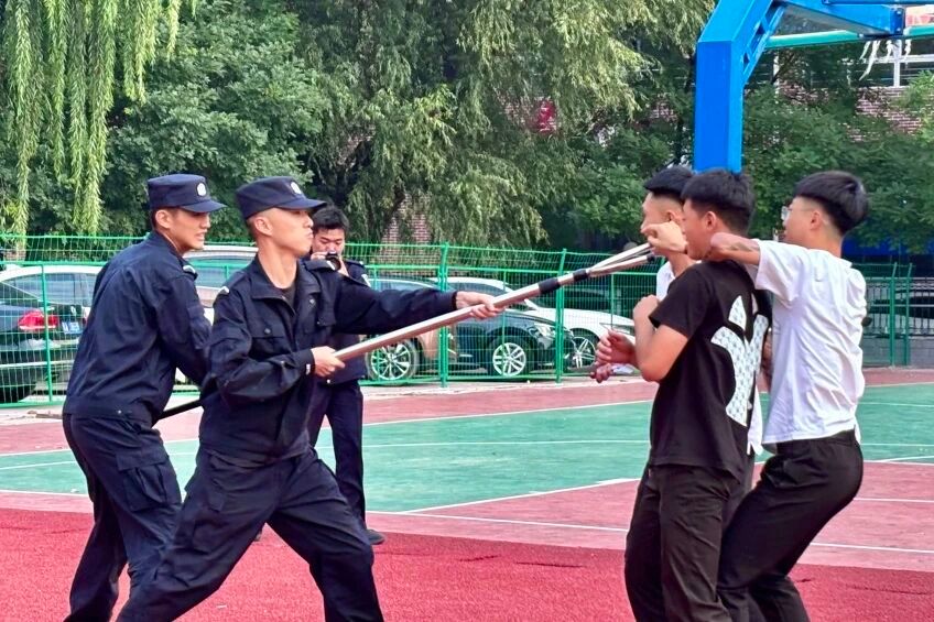 接着两名模拟“歹徒”试图闯入校园,防暴组第一时间持防暴盾牌和钢叉上前阻拦。劝离无效后,队员运用专业器械迅速将其制服并带离现场,充分展现了学院应对突发事件的快速反应和协同处置能力。