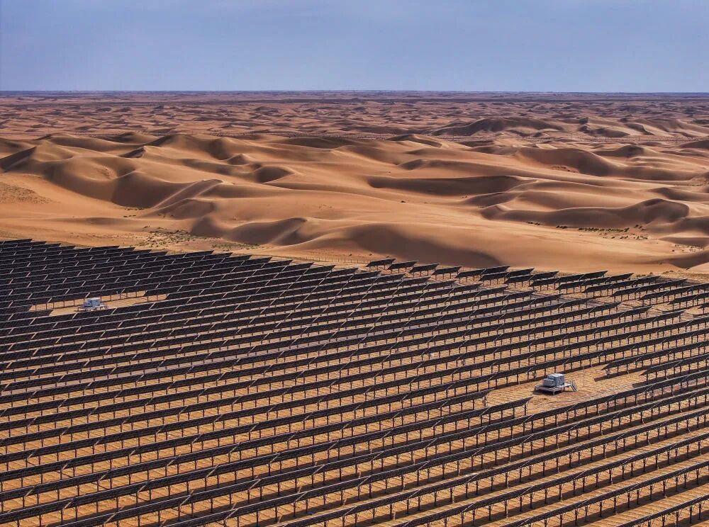这是2025年6月5日拍摄的位于内蒙古巴彦淖尔市磴口县的乌兰布和东北部新能源基地100万千瓦光伏先导工程项目(无人机照片)。该项目地处乌兰布和沙漠。新华社记者 连振 摄