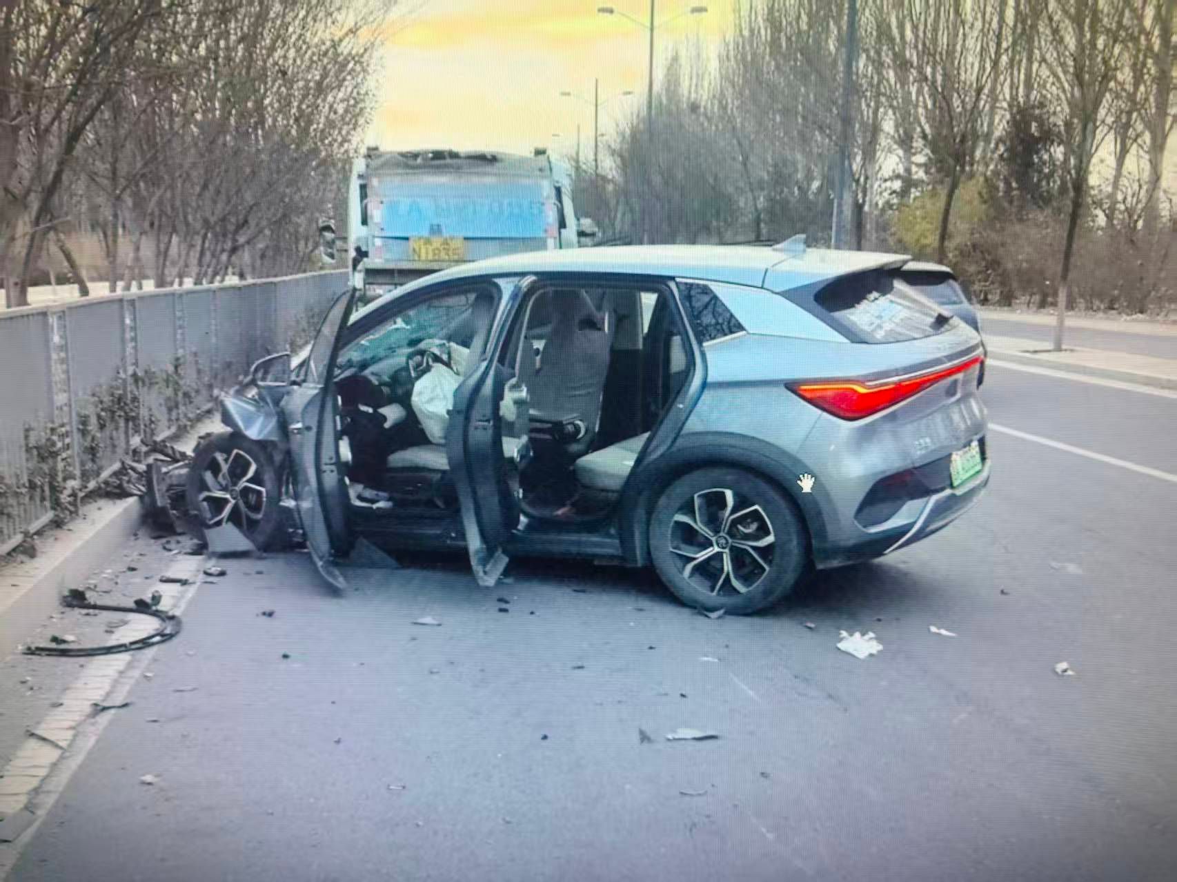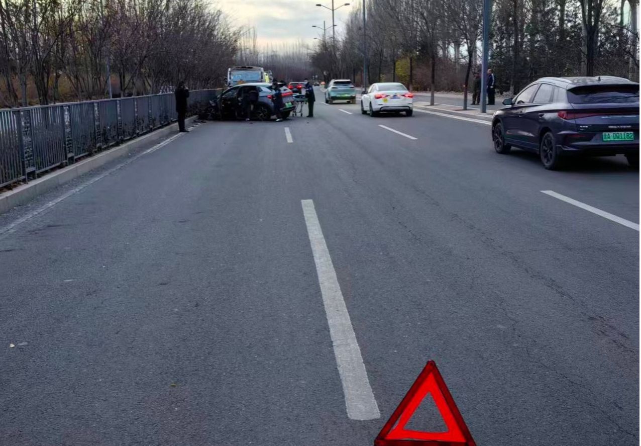 事发当日清晨,天气寒冷、视线不佳,正值早高峰前车流量渐增时段。张晁瑞行车途中突遇一辆SUV与垃圾车追尾,车辆受损严重,现场情况危急。他立即将车安全停靠,并主动指挥疏导后方车辆减速避让、有序变道,有效防范了次生事故发生。