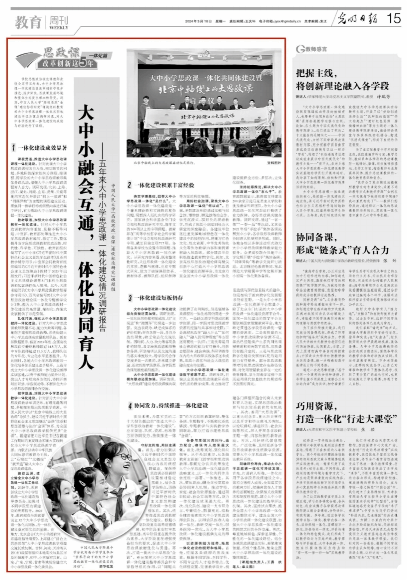 坚持统筹推进,解决大中小学思政课一体化“怎么干”。教育部数据显示,教育部支持建设200余家示范马克思主义学院和优秀教学科研团队,为大中小学思政课一体化常态运行提供了有力保障。办好思政课关键在教师。调研发现,通过“一省一策”“一委一品”等活动,尤其是2021年后“手拉手”集体备课拓展到中小学,各学段思政课教师协同育人机制初步形成。同时,各地各校以多种活动形式助力大中小学思政课教师教学能力提升。众多高校联合当地中小学定期开展“手拉手”集体备课、“同课异构”等教学交流研讨活动。北京陈经纶教育集团、东北师范大学附属中学等定期开展小初高一体化集体备课。