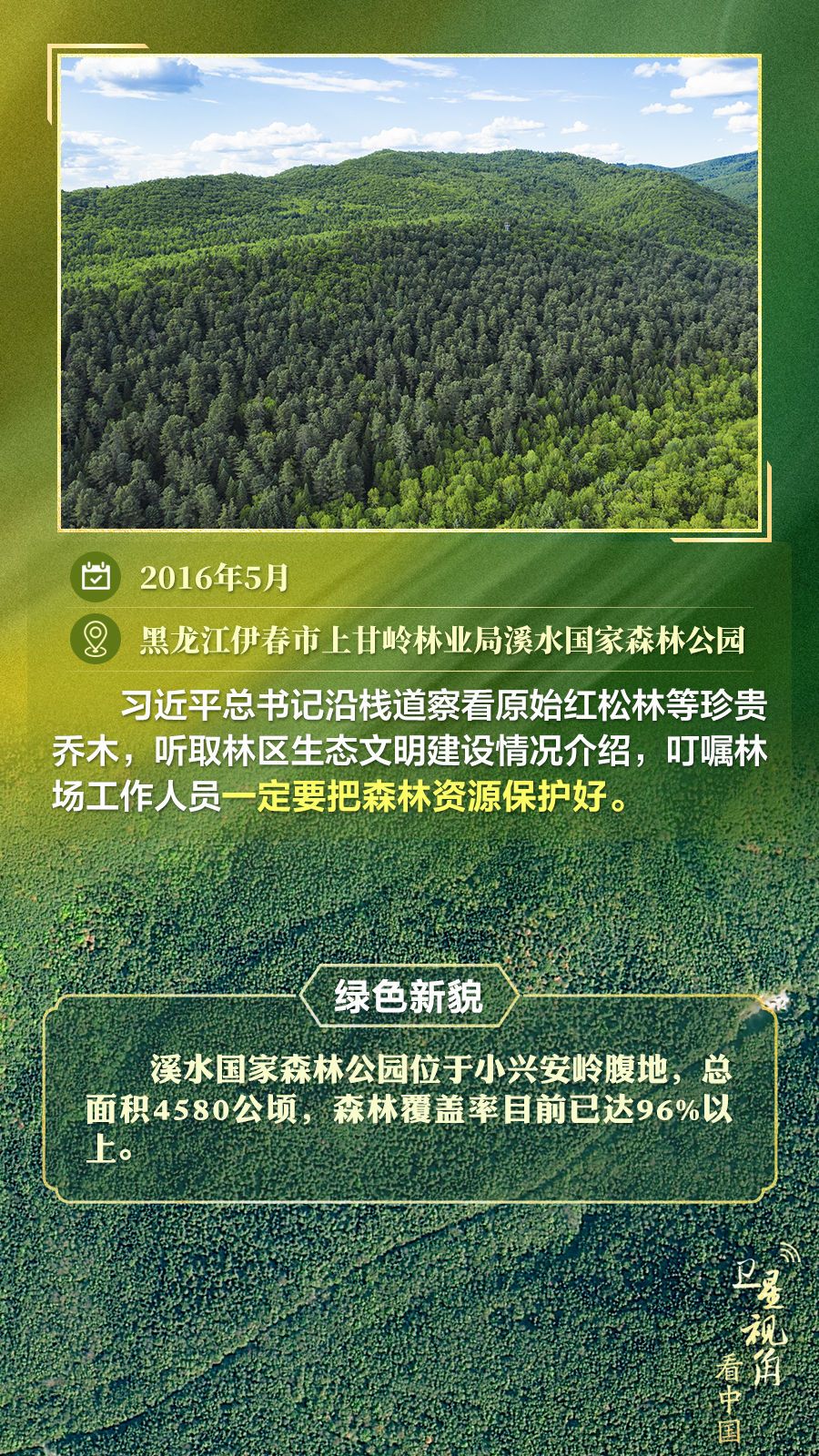 通过卫星视角,一起俯瞰总书记去过的这些林区,重温总书记对造林护林的殷殷嘱托,感受绿色新貌。